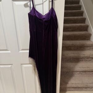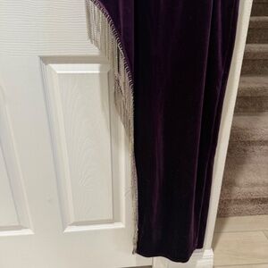 Elegant purple velvet gown that is form fitting, with adjustable spaghetti straps. This dress drapes down a long skirt, highlighted by a delicate silver fringe for a glamorous touch. Perfect for formal events.