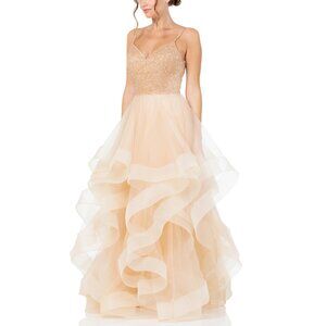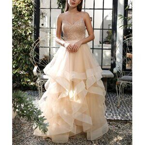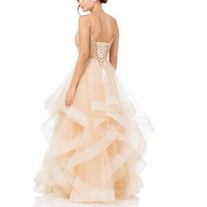 - Brand: Bicici & Coty - Labeled size X-Large and fits like a Size 14 - Approx measurements: - Bust: 40.5" - Waist (Smallest part of the waist): 32.5" - 65" Length - Built-in bra cups - Sleeveless - Beaded sweetheart neckline bodice - A-line tiered ruffle tulle skirt - Corset back - Fully lined - 100% polyester