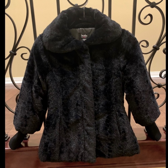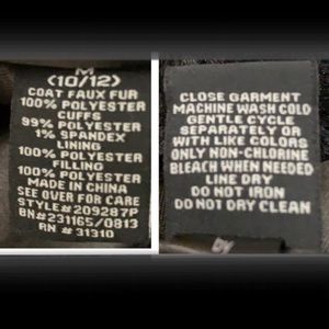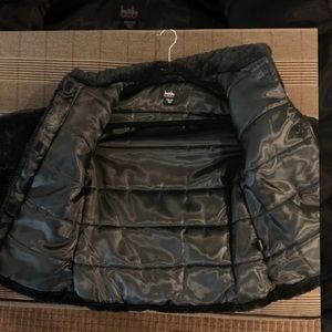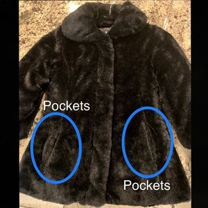 Soft on outside (faux fur) and warm and cozy on inside. Includes pockets on front. Zips up and includes Velcro for extra warmth.