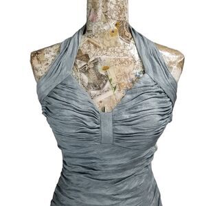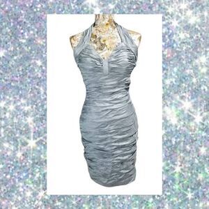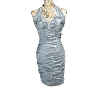 Cachet Light Metallic Blue Halter Gathered Tight Bodycon Cocktail Dress in EXCELLENT Condition sz 4! Retails for $168 at Nordstrom's! Super sexy elegant design! Hugs all your gorgeous curves! Marked size 4, but measures smaller and May have been altered so check measurements carefully.