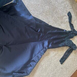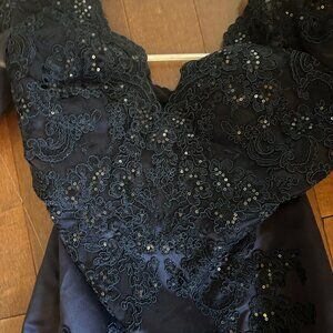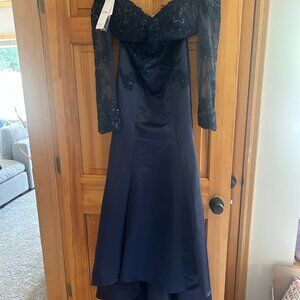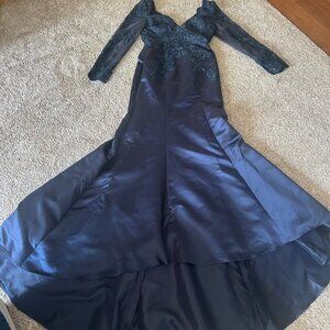 Trumpet/Mermaid V-neck, Sweep Train Satin/Lace Prom/Mother of the Bride Formal Dress with sequins. Size 4. Dark Navy. Bust 33.5", Waist 26.5" Never worn, tags still on.