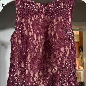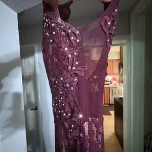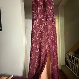 Long burgundy formal dress, worn once, dramatic slit, halter neck, open back
