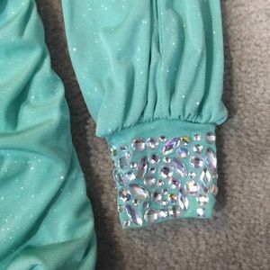 tight spandex dress, gathers at the sides, covered in glitter. one sleeved, slit down the center of the sleeve for an open arm look. worn once to a high school formal. no stains or tears