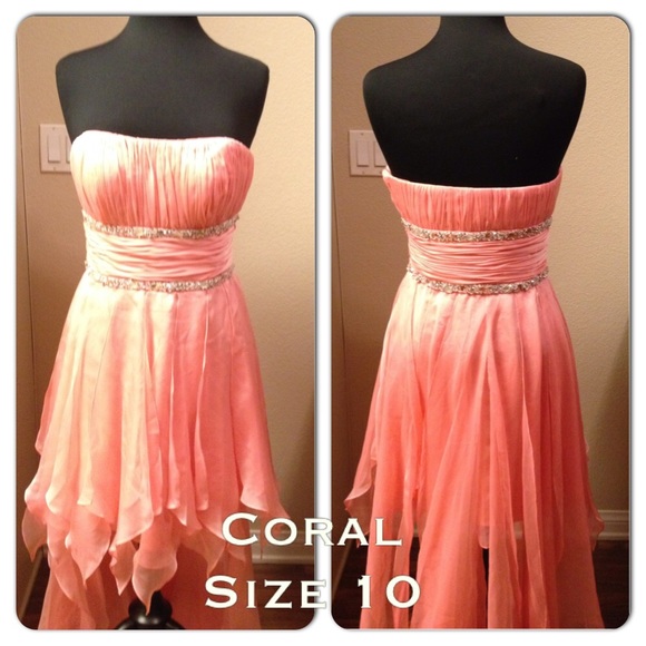 Coral formal dress that's high-low with sequence under bust line