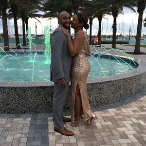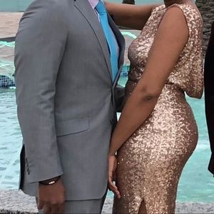 Rose Gold Sequin Dress With Side Slit. Elegant and perfect for a special occasion.