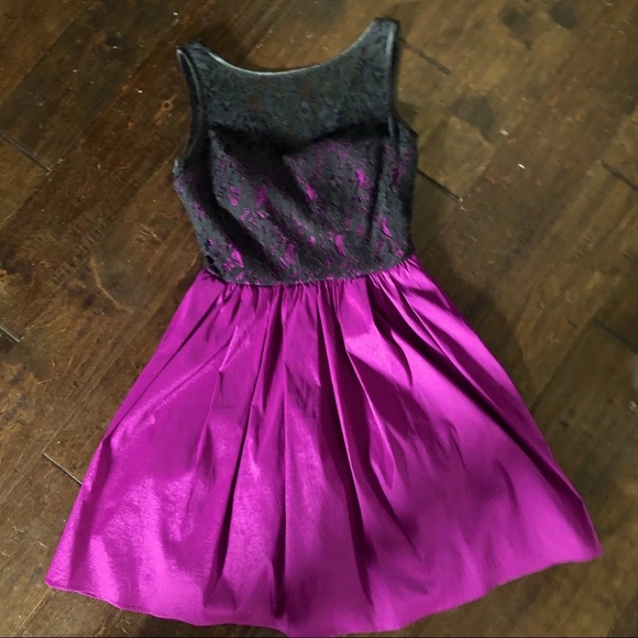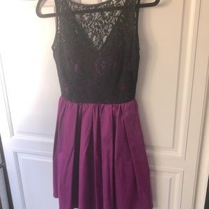Gorgeous semi formal dress. Purple/pink silk with top cornered in dark lace. Dress was worn one time to a High School Homecoming. Hits right above the knee.
