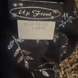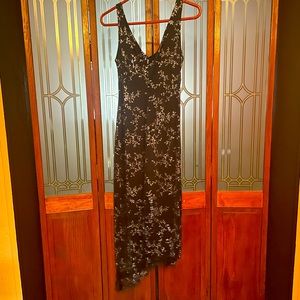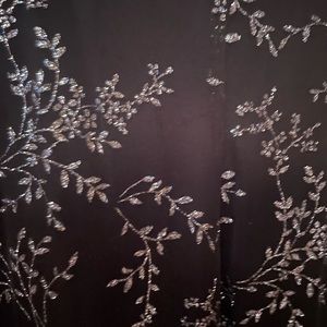 Black with sparkling silver leaf detail. Slant hem.