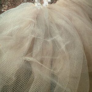 Gently used. Very beautiful dress. Worn twice by each of my daughters for a couple hours at a father daughter dance. There are some areas on the tutu where there are snags or lines. I pictured one, but you can’t really see it when they are wearing it, or you can move it around to where you can’t see it when you’re looking close up. It has a zipper on the side.
