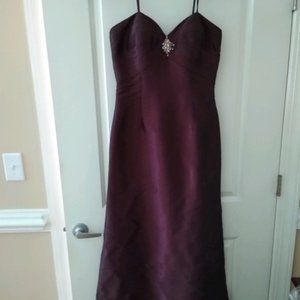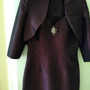 This was worn once by the mother of a bride but would also be great for other formal events. Long length dress with jacket. Color is a plum like color with some sheen to the fabric. No alterations have been made to this size 8