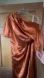 Brand new with tags. Never steamed or dry cleaned. Pictures taken straight out of the packaging (hence the creases and wrinkles). I only tried it on. Formal Dress with Slit One Shoulder, Long (ankle length), Satin, color is Burnt Orange, 16W. Padding on the inside so no bras is needed if you choose not to wear one.
