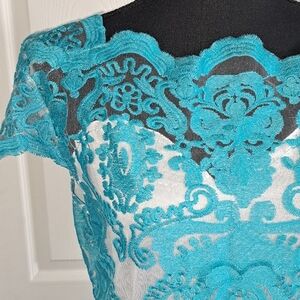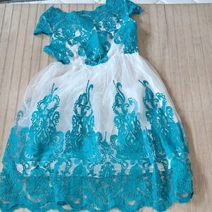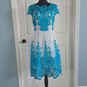 Beautiful white dress with teal embroidery, tulle on bottom portion for a fuller skirt. Lined, short sleeves. So pretty! Pictures don't do justice. It's definitely a Jessica Parker dress. Perfect for a festive occasion, prom, wedding, dance, Easter, or any special occasions. This is a brand new dress never worn and in perfect condition.