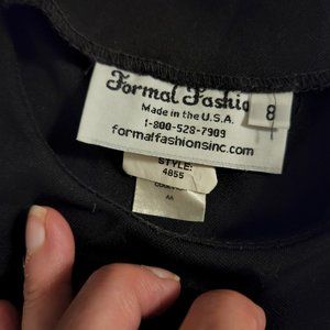 Gorgeous black gown and it is washable! Size medium 8 eight. It is beautiful on and is simply elegant and classic. Long gown 47" from waist to bottom hem. By Formal Fashion. Black ribbon around waist and ties in back