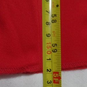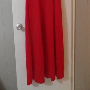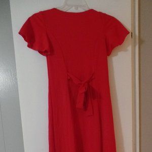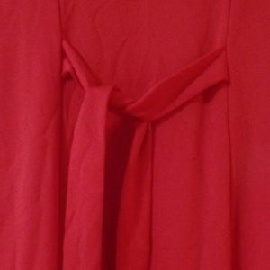 Women's dress by Formal Fashions Inc. This is the princess style dress in vibrant red with sweetheart neckline, bell sleeves and tying sash located on back side. 100% polyester size 00. Made in the USA and machine washable. Excellent condition with no tears, snags, stains or holes. This dress is long but does have an unfinished hem (see photo) so could easily be altered to fit. Measures 60" long from shoulder hem to bottom hem. 18" across, measured armpit to armpit when lying flat.