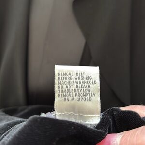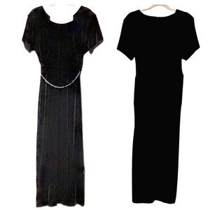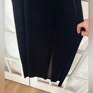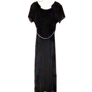 The details on this full length gown elevate the simple slim figure flattering black velour material. The gold chain belt with rhinestones can be removed giving the dress a whole new look. The neckline is uniquely designed and so feminine. The front slit is tastefully placed at 19” . The back zipper is perfectly hidden in the design. Shoulder pads and lining on the inside gives that added touch. Super Flattering!