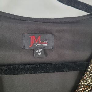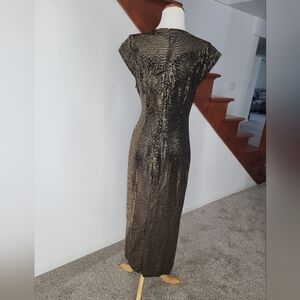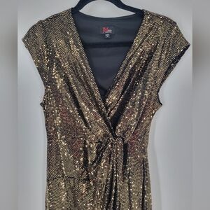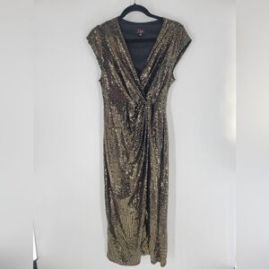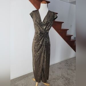 Formal Gold Black Sequin Gown Women's Size 8P Faux Wrap Cap Sleeves