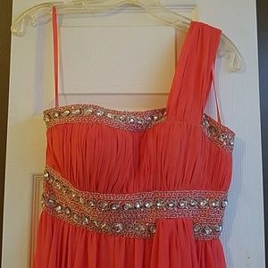 You are sure to feel like a Princess in this gorgeous single shoulder flowing formal w/scarf. Worn only once and coral in color... this beauty features a diamond studded bodice with silver beaded embroidery. Gown is 100% polyester but lining appears satin like with sheer flowy overlay. Scarf is sheer with silver beads & embroidery along each end. Model image shows shoulder strap tucked for strapless fit!