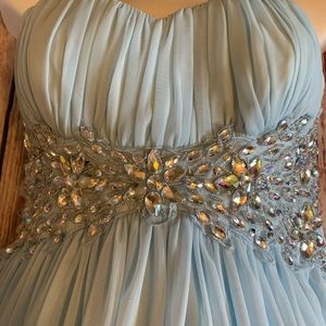 Beautiful Formal Gown size 5/6 baby blue with beautiful rhinestone embroidery. Strapless with padded cups and zipper closure in back. NWOT. Never worn. Gown comes to mid thigh. Absolutely stunning dress.