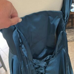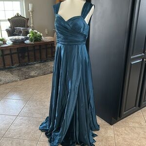 This is brand new without the tags. Beautiful teal satin color. Corset lace up back. It wraps in the front allowing for great movement. Padded upper. Extra straps. From a boutique bridal store. size 12, but I feel it fits more like a 14.
