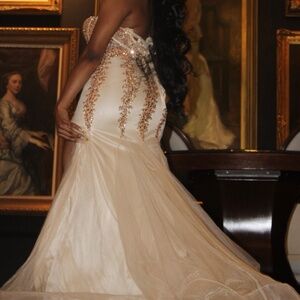 Champagne Color with Satin and sequin finishings. Tull skirt with Train