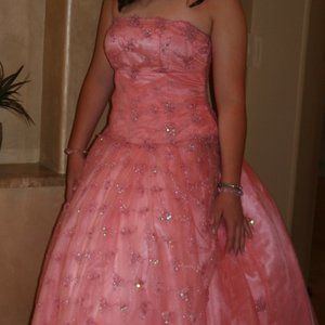 Custom made gown Size L /12. Embroidered Tulle, Organza over satin. Lace up corset back. Worn for only a few hours, dry cleaned. Color a shade of Guava, Rose/Watermelon Pink. Photos show gown being worn with a petticoat underneath which looks fuller. Petticoat NOT included. Please inquire if additional photos, measurements are needed.