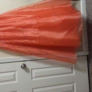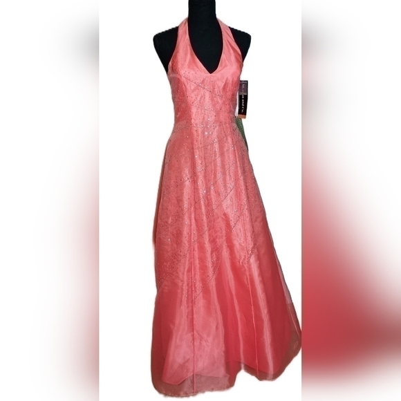 Morgan and Co. formal peach colored halter dress. Beautiful peach satin overlaid with netting and sequins. There is a crinoline underlay. This would be so pretty at homecoming. The peach color would be so striking against the hints of a summer tan. This is new with tags. Make an offer. Thanks for shopping 🛍️