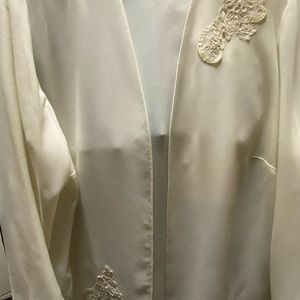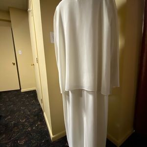 Two Sequin appliqués on front of jacket. Sleeveless gown with back kick pleat. Jacket semi sheer.