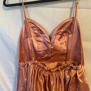 Satin coral dress. . Spaghetti straps and sweetheart neckline. Has beading in front of dress. Loop inside of dress needs sewing up as shown in picture. Size 8.