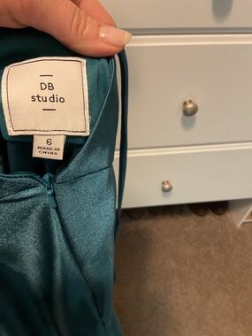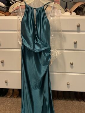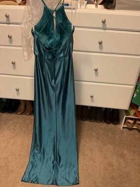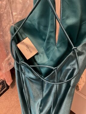 Stretch satin in aquamarine. Never worn. Purchased from David’s Bridal. Very flattering.