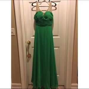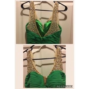 Beautiful emerald green formal dress! Never worn! (The picture of the white dress is from the website because the dress did not fit me so I could not model) the dress has a sheer layer on top. There is no tag however it is a size 2. The sequins on the neck line are gold and silver as seen in the photo.