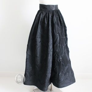 Vintage/preowned Sully Bonnelly (designer for Mizrahi) long black formal skirt. Lined/dry clean only. Made from what we believe is a rayon blend fabric (no content tags), it features tons of pleats in various patterns throughout! Both the lining and the skirt hem are stabilized with horsehair (nylon roping) giving it a dramatic edge but you can elevate the drama with a crinoline slip! Vintage/preowned w/minimal signs of prior wear. Tagged SULLY BONNELLY and MADE IN USA size 8, it measures: waist: 28", hips: free, length: 44".