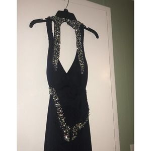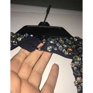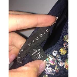Women’s size 3 city studio beaded navy blue padded dress V-neck top flowy comfortable material has cutouts in the back missing a tiny bead on the back as shown in photos has zipper and clasps to make the dress tighter I would say this is more for a petite frame