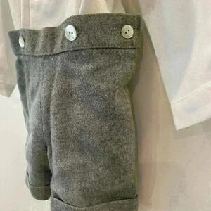 Excellent condition - worn once for wedding photos. Beautifully made - cotton top and wool blend trouser shorts. Mother of pearl buttons, hidden buttons to attach top to shorts. Grey pipping along collar. Long sleeves and short pants.