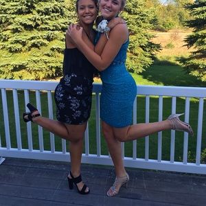 Pretty blue sequenced dress! So comfortable and fitting! Comment for details on width and height! So perfect for dances or parties! ONLY WORN TWICE!!:)