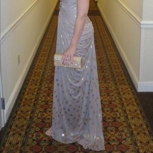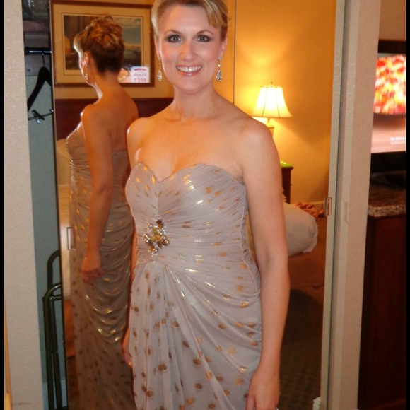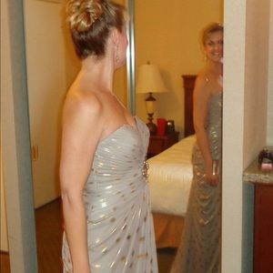 Stunning, strapless Adriana Pappell evening gown. Dress molds perfectly to bust line -no worries of constantly tugging or pulling it up. (I'm a 34 b ) Crystal/pearl adornment on bodice. Gorgeous bustle around derrière and flies into a slight train. Gently worn once. Make me an offer and enjoy the compliments!