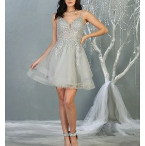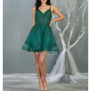 Beautiful short formal evening dress with lace applique and open back. Sizes 2 4 6 8 10 12 14 16 18 20. View the highlighted sizes in green in the photos section with the bust ,waist and hip measurements underneath each size. Colors available are baby blue, burgundy, hunter green, mauve, royal blue, or silver. When ordering put the color you want in the comment section.