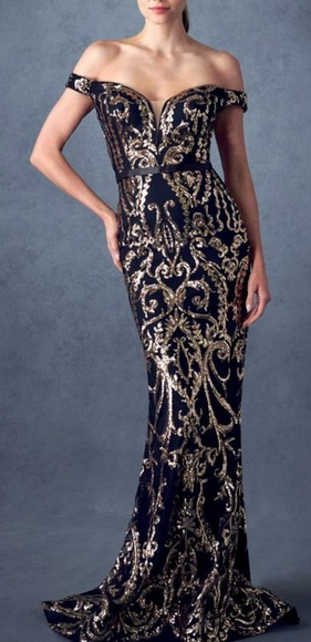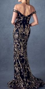 Off shoulder trumpet gown with sequins and mesh. Sizes small medium large extra large. Size chart in the photos section . Color is black /gold