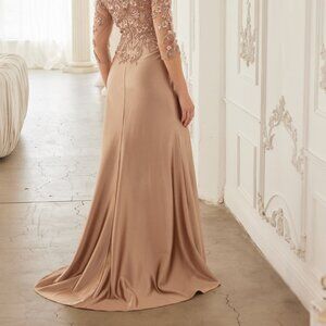 THIS ELEGANT FORMAL DRESS FEATURES A U-NECKLINE AND AN EMBROIDERED BEADING APPLIQUE BODICE FOR A TOUCH OF REFINEMENT. THE SHEER 3/4 SLEEVES ADD A DELICATE, ROMANTIC ELEMENT. THE DRESS IS CRAFTED FROM A LUXURIOUS SATIN MATERIAL AND HAS A BACK ZIPPER CLOSURE FOR A SEAMLESS, TAILORED FIT. STRETCH MATERIAL!