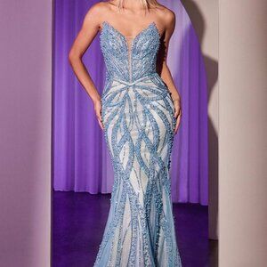 This fitted strapless gown features a plunging neckline and an embellished contouring motif that beautifully enhances your silhouette. Crafted from crystal and pearl-embellished tulle overlay, the structured bodice offers both support and style. Ideal for prom, formal events, and red-carpet premieres, this gown is designed to make a glamorous statement.
