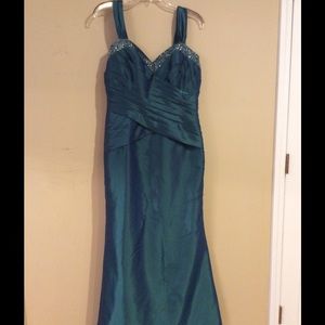 Worn once as " mother of the bride". Sleeveless with wide straps and bolero jacket. Iridescent teal.