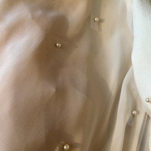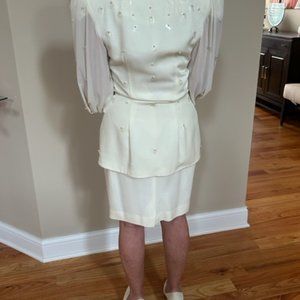 It is a stunning formal suit from a wedding. It has a stunning neckline featuring a high back collar and a sweetheart front neckline. Ithe top is fully line, with sheer sleeves covered with pearls and iridescent paillettes, It stakes for stunning pictures.