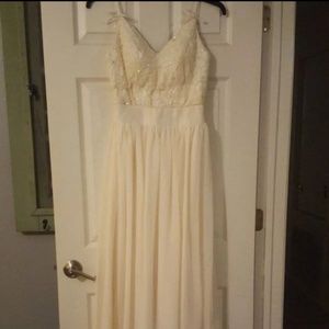 This stunning piece of work is crafted to fit snuggly around the waist and float gently around the hips. The delicate detail of the beaded bodice, the lace trim along the bottom of the skirt, and the hidden sexy slit make this a seriously unique gown.