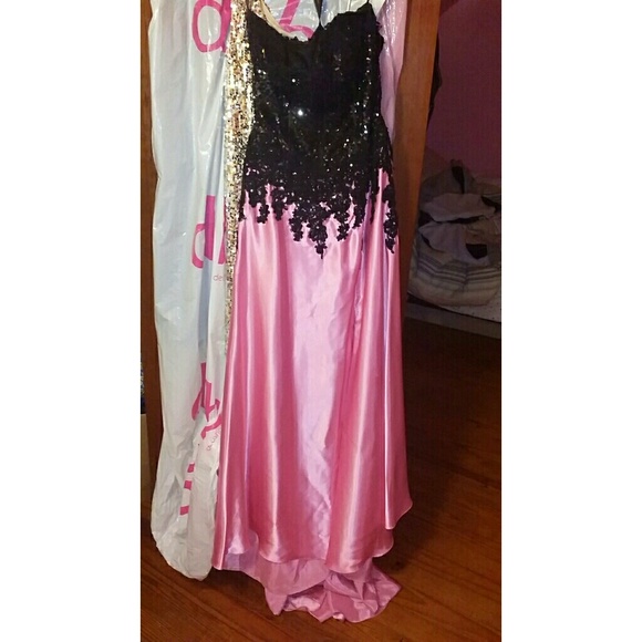 Size 6 Jovani. Strapless. Has a train. Pink with black sequins. Wore a few hours.