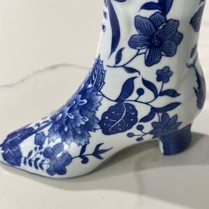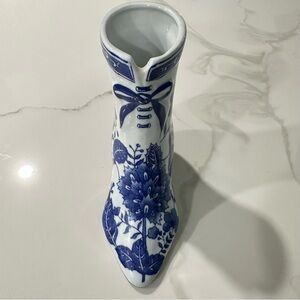 Elegant ceramic boot vase with blue floral design. Perfect for home decor.