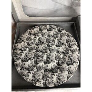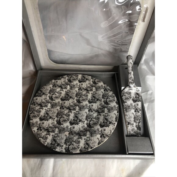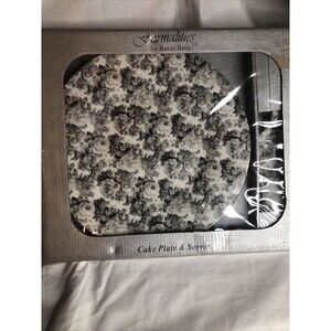 Formalities by Baum Bros Cake Plate & Server, White & Black Rose Print Gold Rim