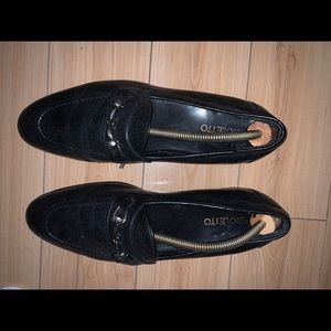 Silver bits on a black leather round-toe.
