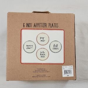 Set of 4 white appetizer plates with black text 'pig out'. Get these cute and festive decorative App plates. They are sure to bring enjoy and fun to any BBQ, dinner party or just a impromptu get together! NEW WITH TAGS.