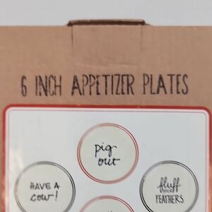 Set of 4 white appetizer plates with the black text 'pig out'. Get these cute and festive decorative App plates. They are sure to bring enjoyment and fun to any BBQ, dinner party or just an impromptu get-together!