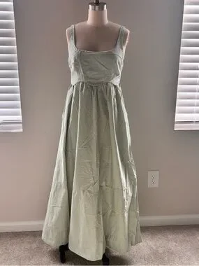 Elegant light green maxi dress with a square neckline and wide straps. Soft, flowing skirt creates a relaxed yet polished silhouette. Lightweight fabric for comfortable all-day wear. Perfect for daytime events and warm-weather outings.