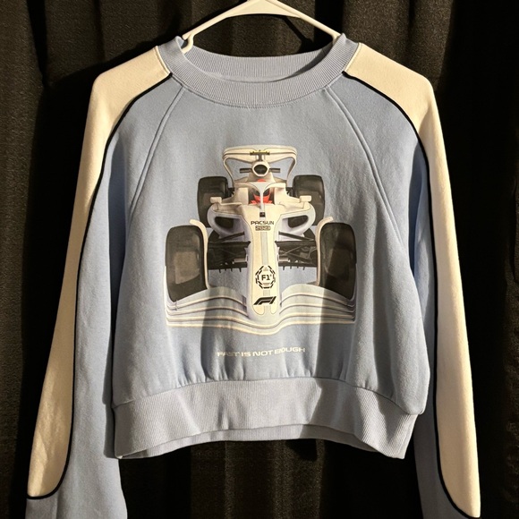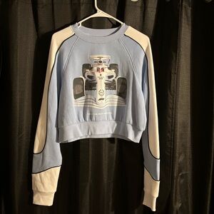 Elevate your casual style with this graphic crew neck sweater. Featuring a bold racing car design, this sweater combines light blue and white for a fresh look. Perfect for everyday wear.