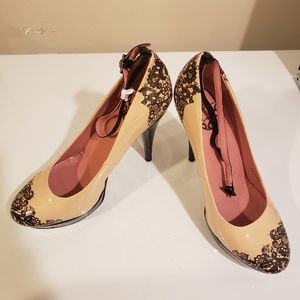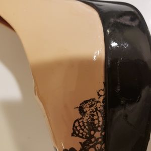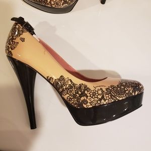 High heel platform shoes sexy. 5 inch black patent leather heel with black lace detail around the heel and toe Ankle straps. Never worn. Small defect in patent in the one platform {shown in the 4th picture).